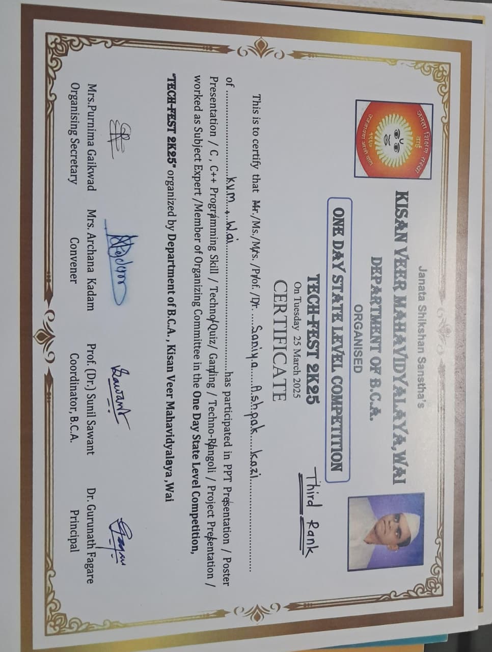 75 2024-25 Miss. Saniya Ashpak Kazi, Miss. Muskan Ashpak Kazi BCA II 63 Third Rank in poster presentation in TECH-FEST 2k25 at Kisan Veer Mahavidyalaya Wai State level PDF