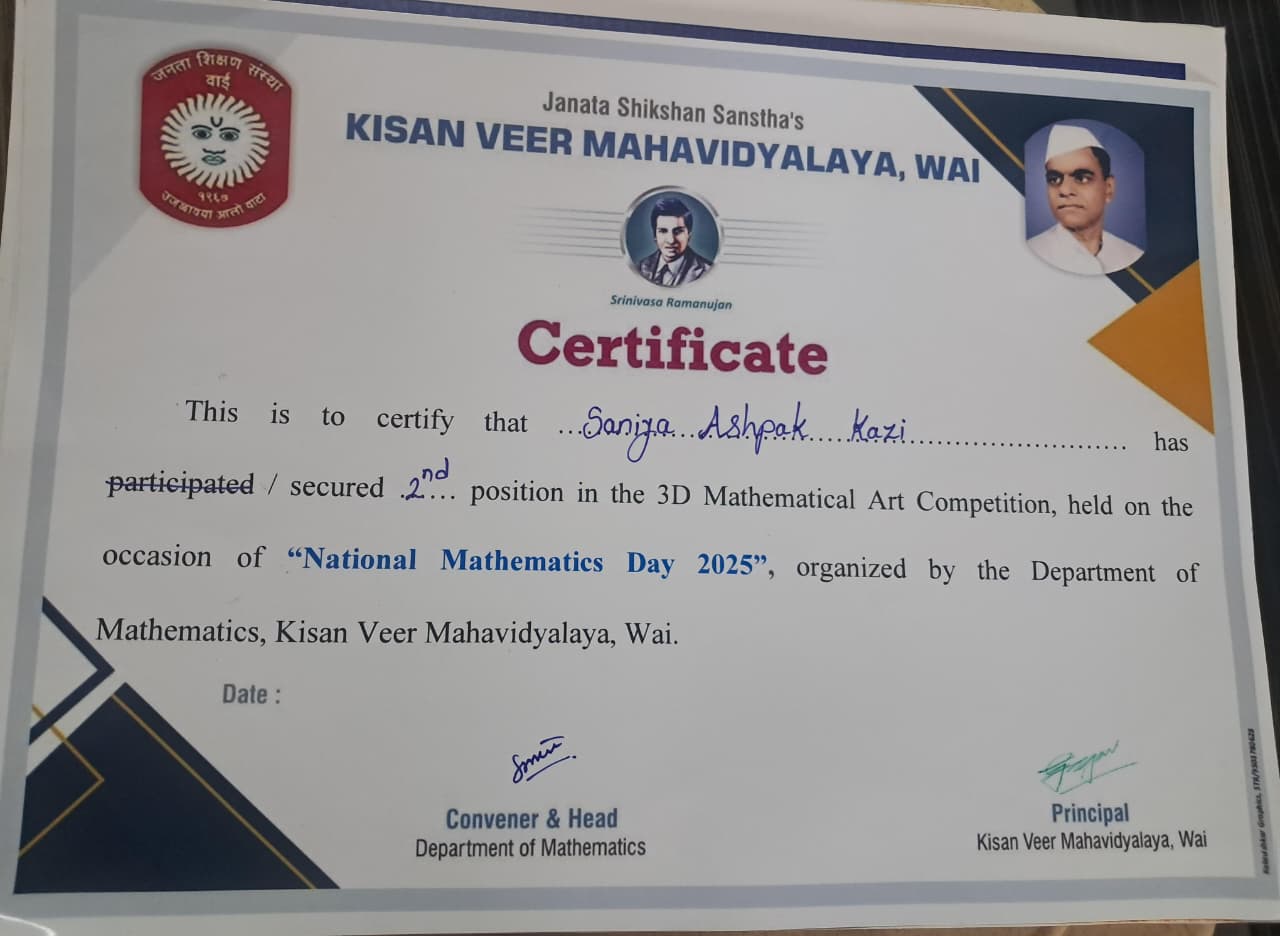 76 2025-26 Miss. Saniya Ashpak Kazi BCA III 62 Second rank in 3D mathematical art competition institute level PDF