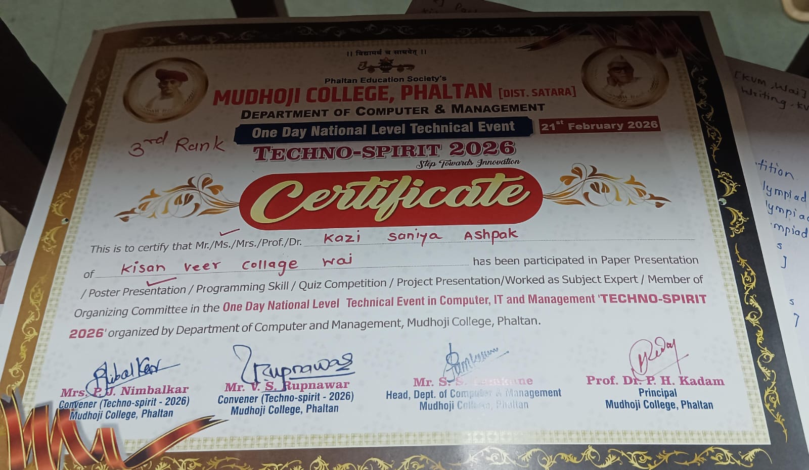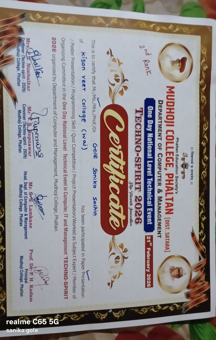 77 2025-26 Miss. Saniya Ashpak Kazi BCA III 62 Third rank in Poster Presentation Techno-Spirit 2026 at Mudhoji College Phaltan National level PDF