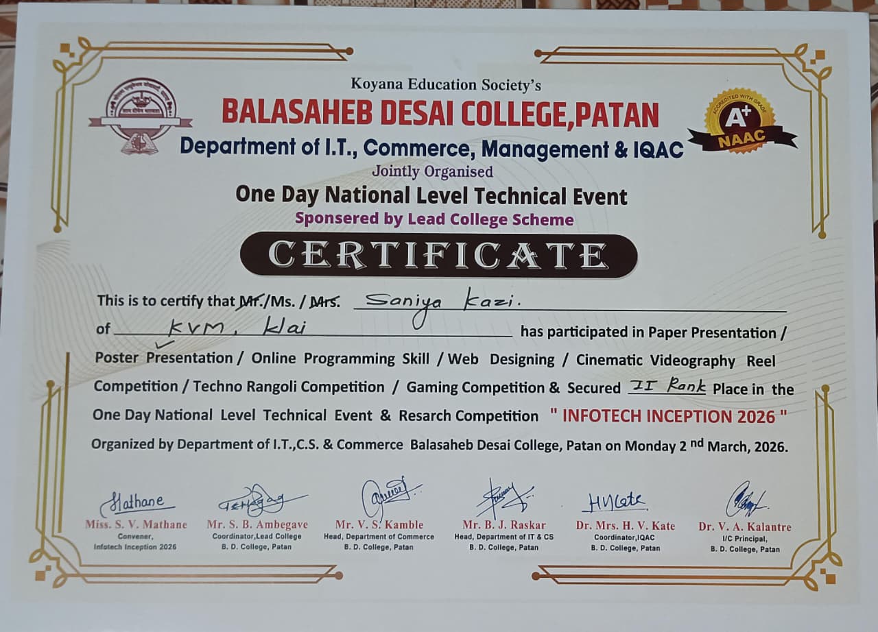 78 2025-26 Miss. Saniya Ashpak Kazi BCA III 62 Second Rank in Poster Presentation for Infotech Inception 2026 at Balasaheb Desai College Patan National level PDF