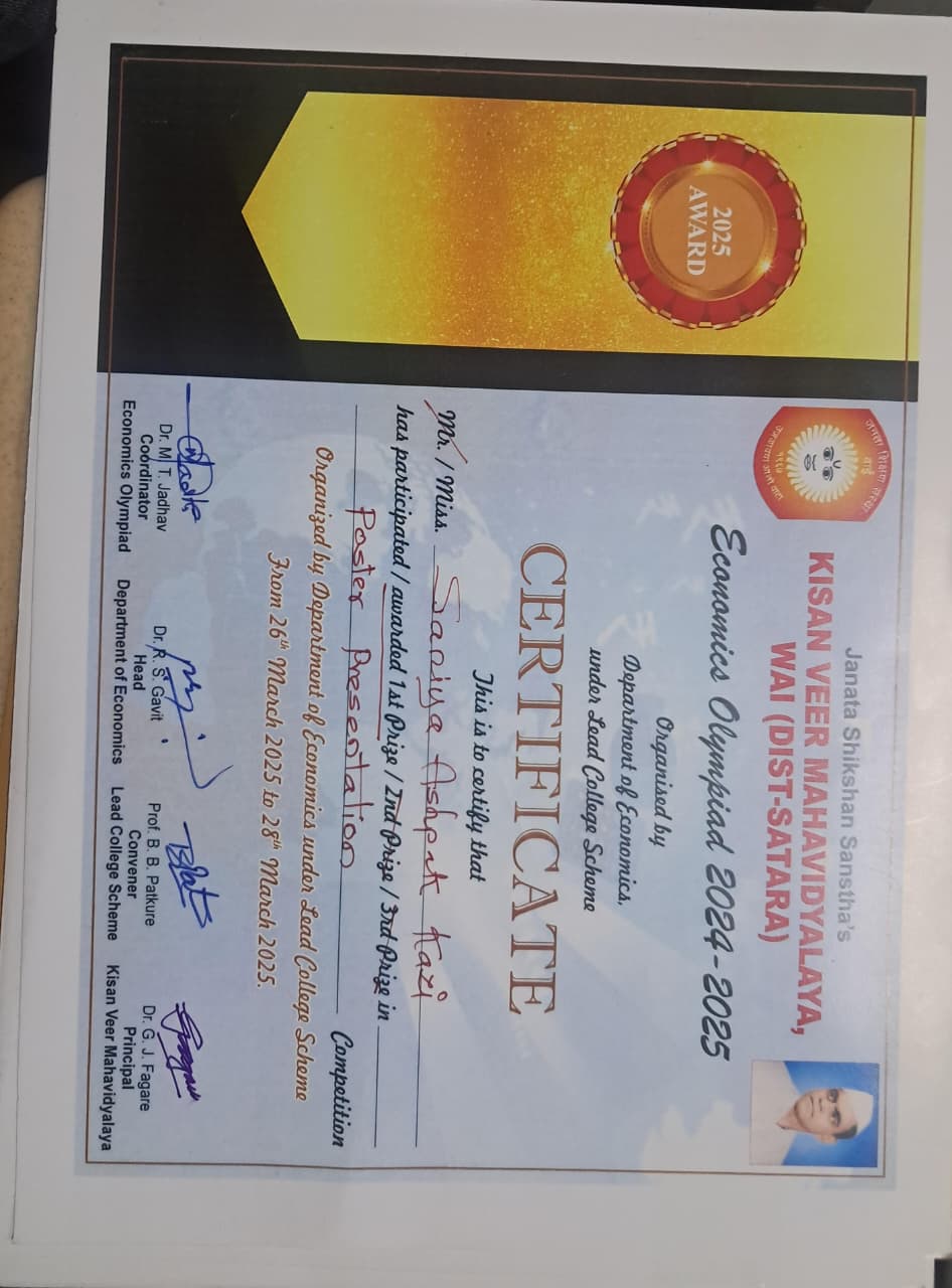 74 2024-25 Miss. Saniya Ashpak Kazi, Miss. Muskan Ashpak Kazi BCA II 63 First Rank in poster presentation in Economics Olympiad at Kisan Veer Mahavidyalaya Wai State level PDF