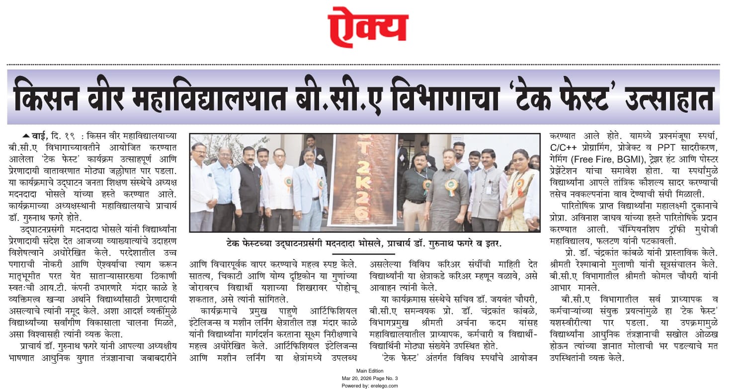 Welcome to BCA Department of Kisan Veer Mahavidyalaya, Wai