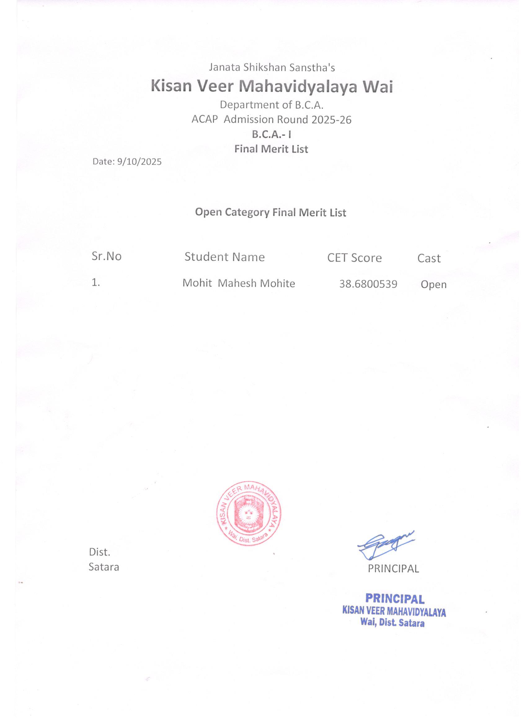 Welcome to one of the most progressive and innovative college in Maharashtra which is located in Wai. Kisan Veer Mahavidyalaya, Wai is affiliated to Shivaji University, Kolhapur. The College is committed to achieve the highest academic standards. Under the guidance of the visionary leadership of Hon'ble Shri Prataprao Bhosale, the college has made a number of avenues available for the all-round development of the student population. The college has very attractive and naturally beautiful campus of nearly 20 acres. The college has Arts, Commerce, Science and BCA faculties. The BCA course has been providing quality education for the opening in the IT sector. The college is dedicated to expanding the pool of knowledge and creation of ideas through excellence. The college has geared up to incorporate new opportunities in the field of education, research, sports and cultural activities. By considering the importance of Computer Science, the college provides the well-equipped Computer Labs, Infrastructure and qualified Faculty. I humbly appeal one and all students to join our college and make your future bright and prosperous.