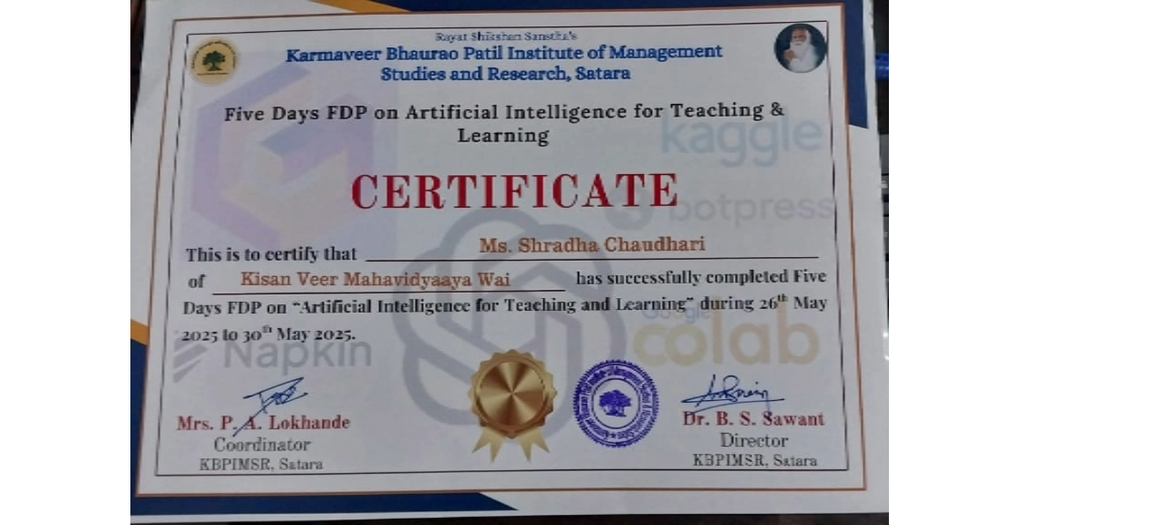 2024-25 BCA FDP State Miss. Shraddha Sharad Chaudhari Five Day FDP on Artificial Intelligence for teaching and learning 30-05-2025 5 Attended View View